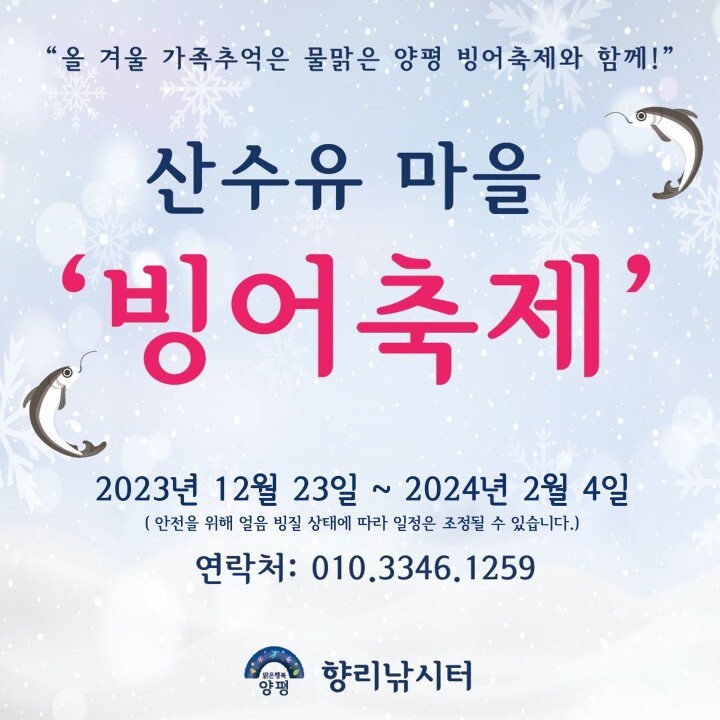 올해로 6번째가 된 양평 산수유마을 빙어축제는 서울에서 1시간 거리에 위치한 6만여 평의 아름답고 넓은 저수지 위에서 펼쳐지는 겨울 축제입니다. 얼어있는 저수지 위에 올라 구멍을 뚫고 빙어낚시를 체험하고 얼음썰매도 타는 온 가족이 즐길 수 있는 축제입니다.